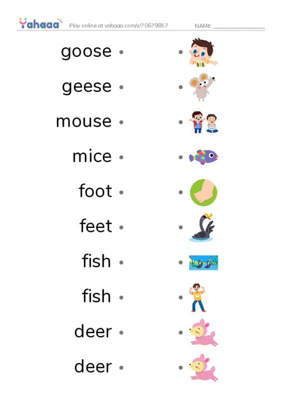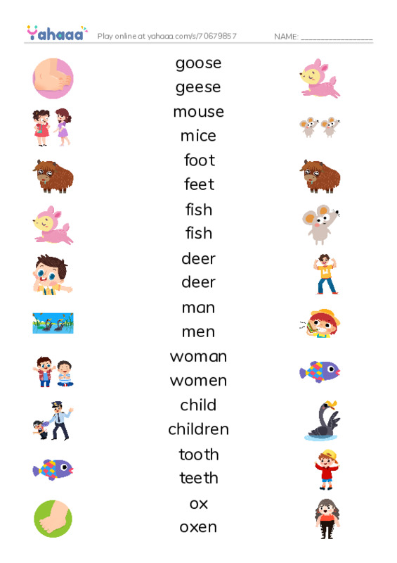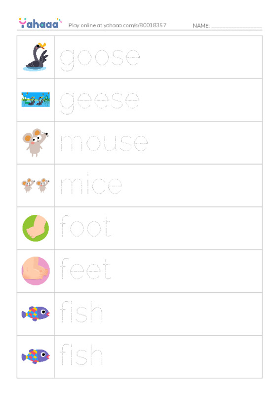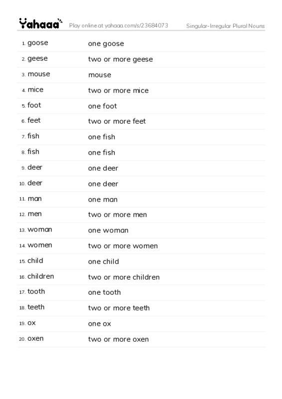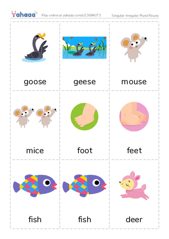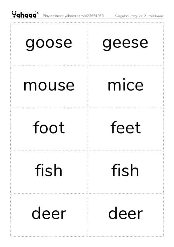 goose, geese, mouse, mice, foot, feet, fish, deer, man, men, woman, women , child, children, tooth, teeth, ox, oxen
