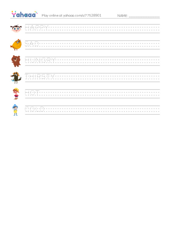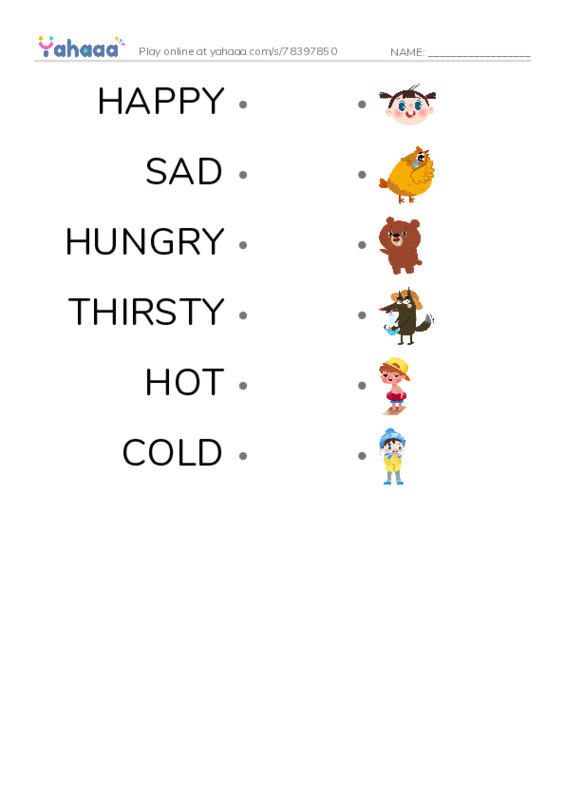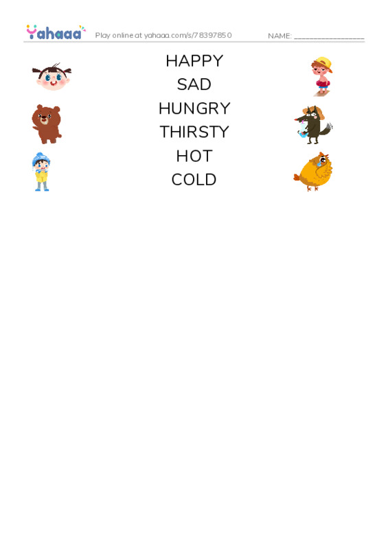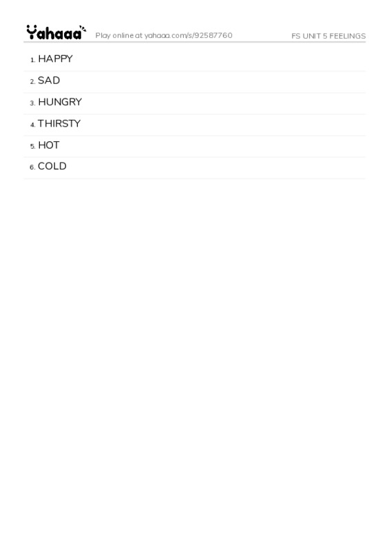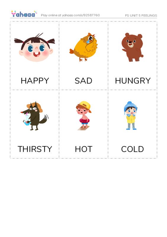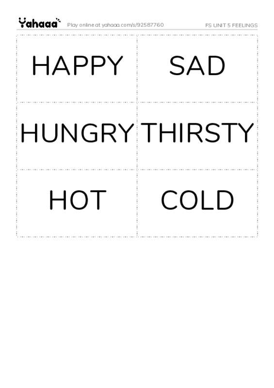 HAPPY, SAD, HUNGRY, THIRSTY, HOT, COLD