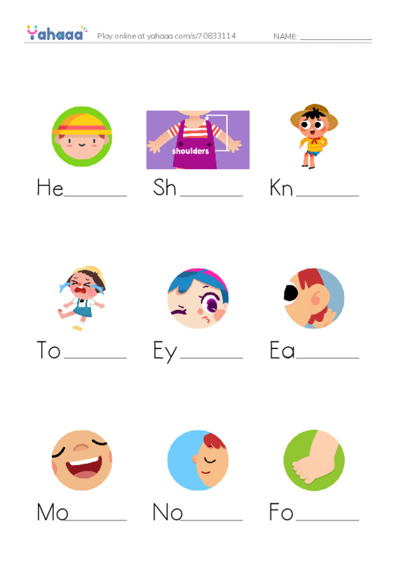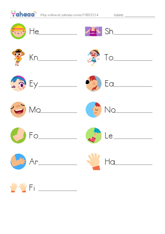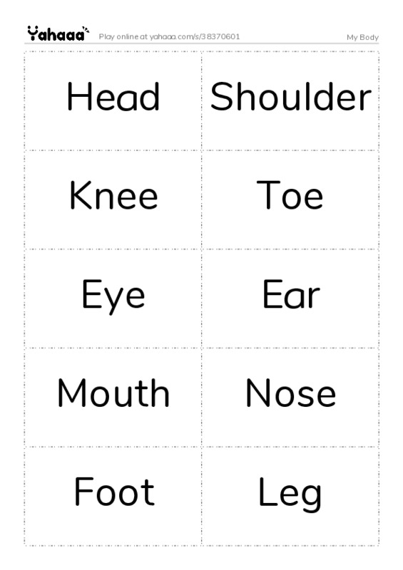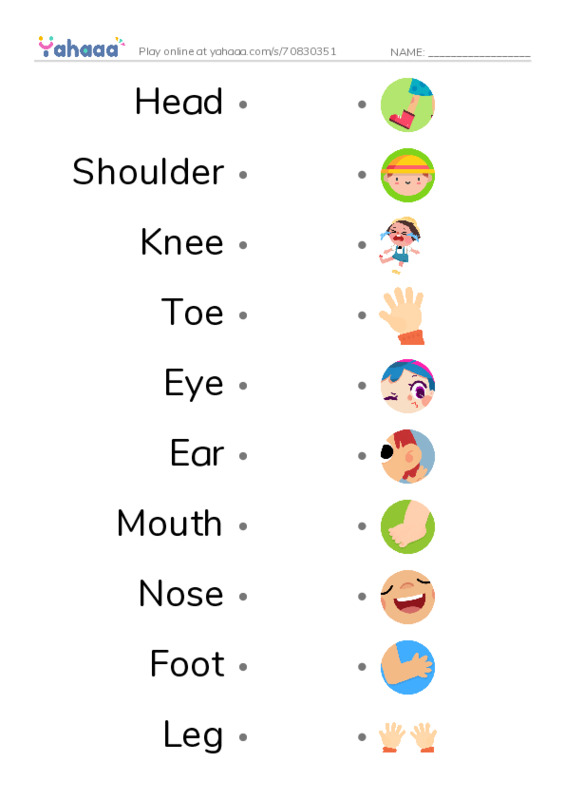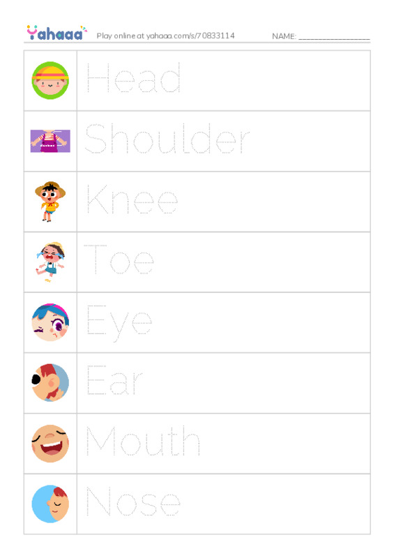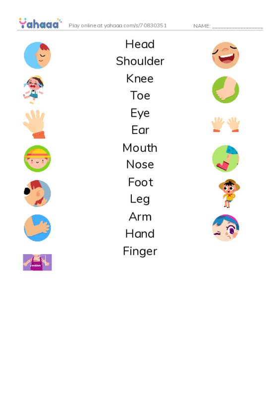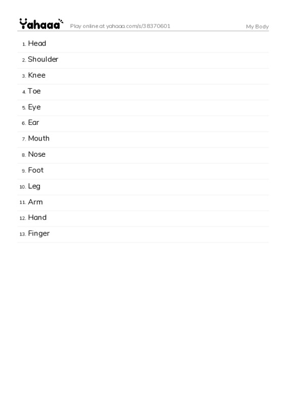 Head, Shoulder , Knee, Toe, Eye, Ear, Mouth, Nose, Foot, Leg, Arm, Hand, Finger