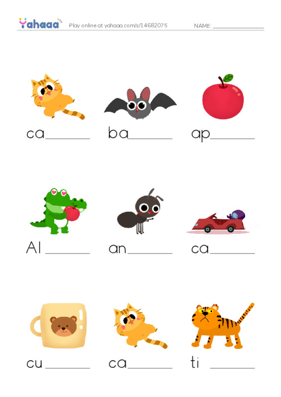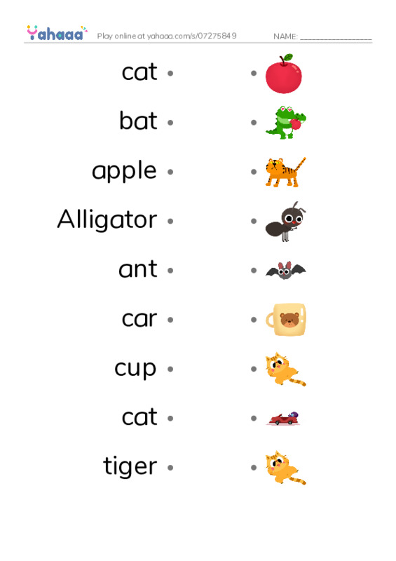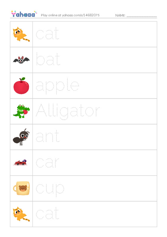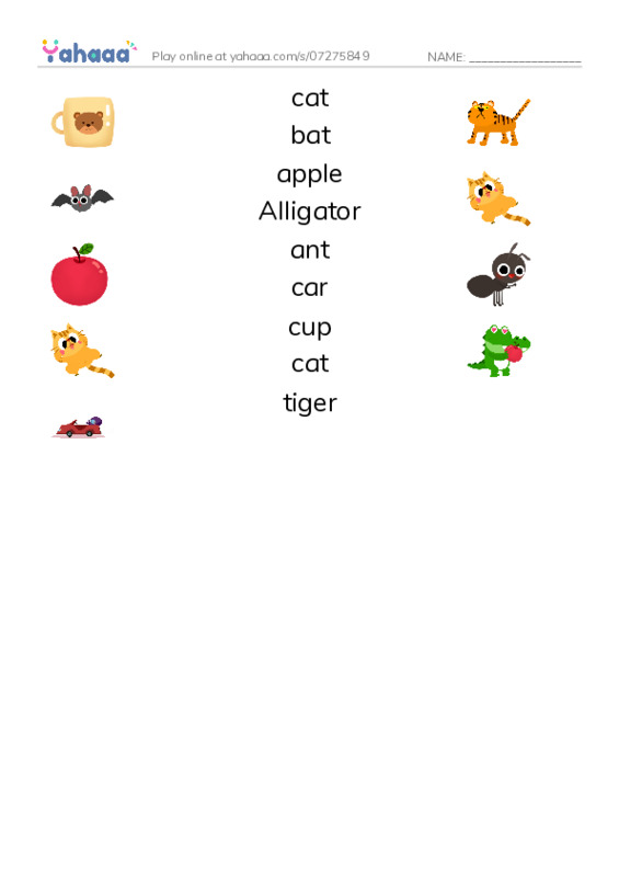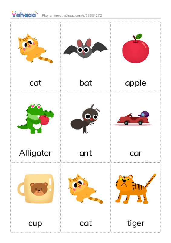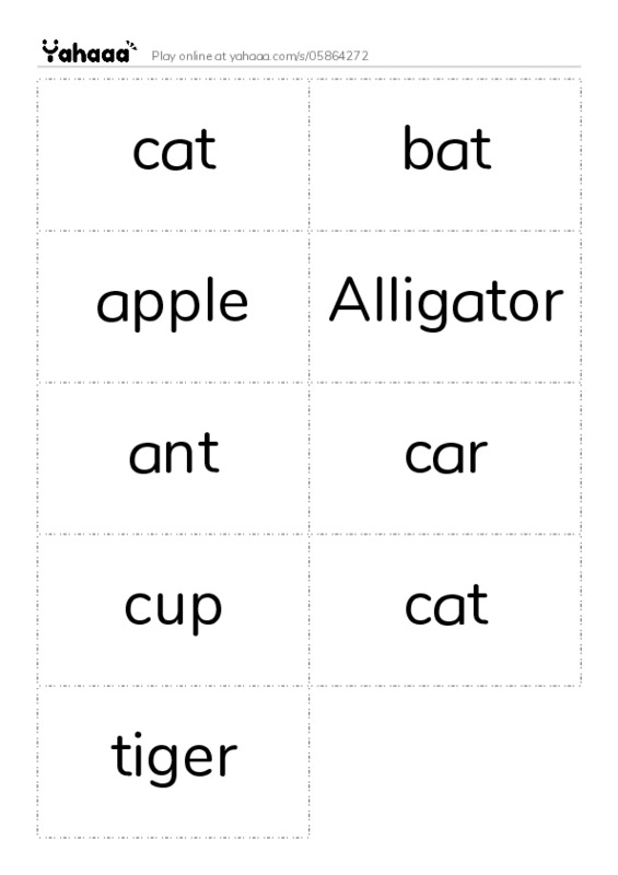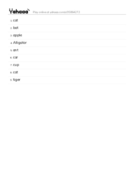 cat, bat, apple, Alligator, ant, car, cup, tiger