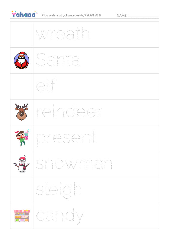 wreath, Santa, elf, reindeer, present, snowman, sleigh, candy, star