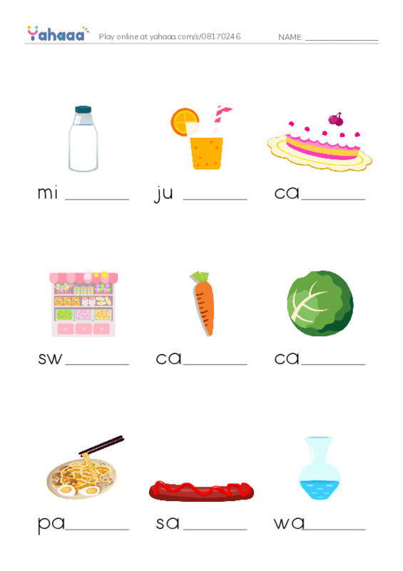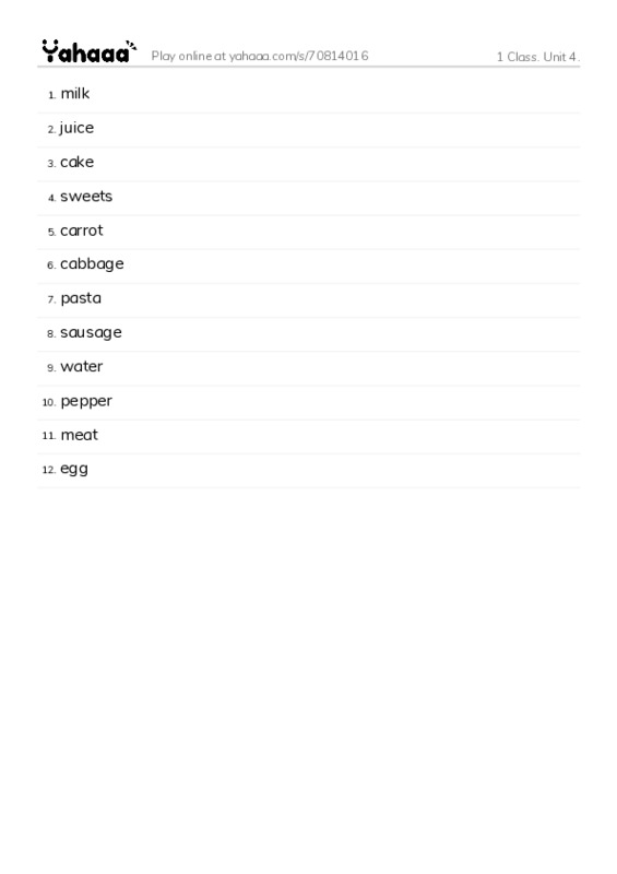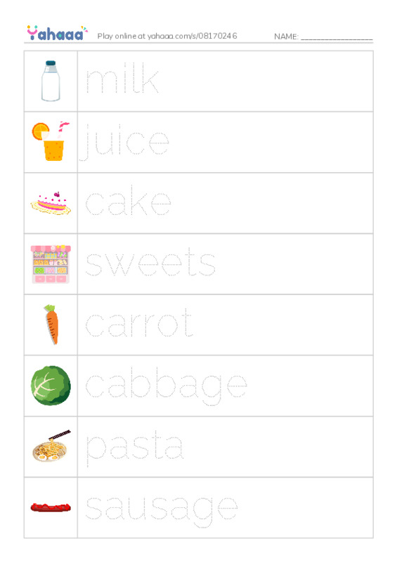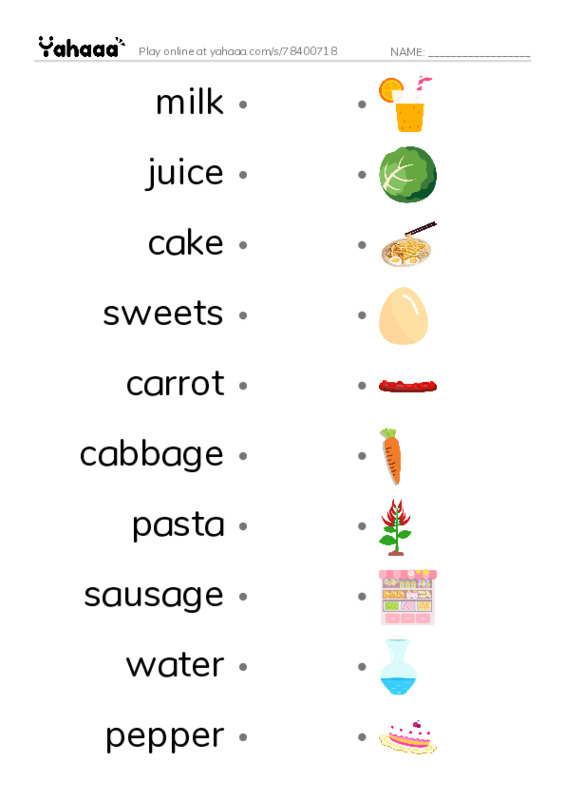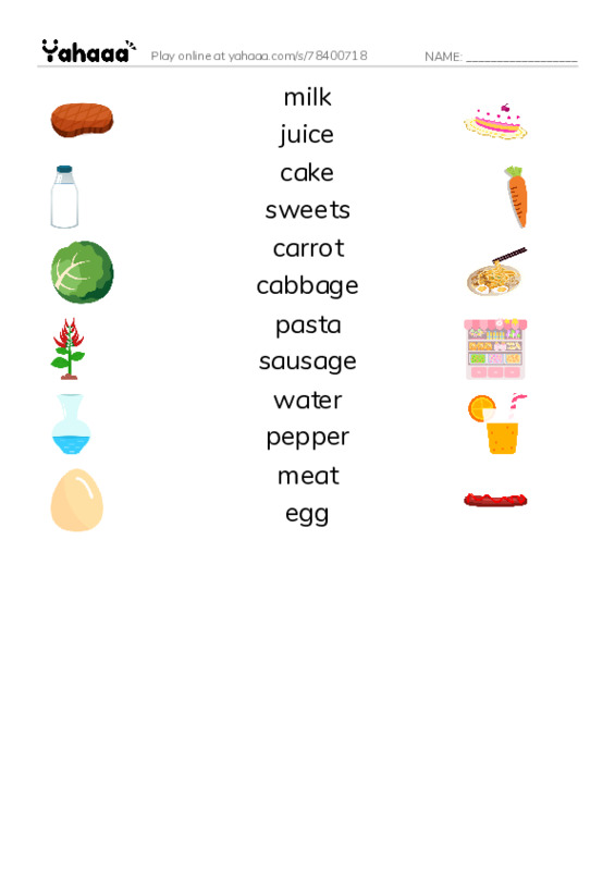milk, juice, cake, sweets, carrot, cabbage, pasta, sausage, water, pepper, meat, egg