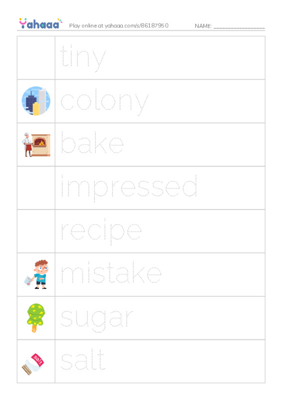 tiny, colony, bake, impressed, recipe, mistake, sugar, salt, grandma, wise, advice, grateful, kind, helpful, fancy, happy