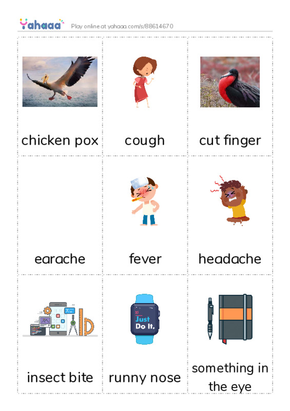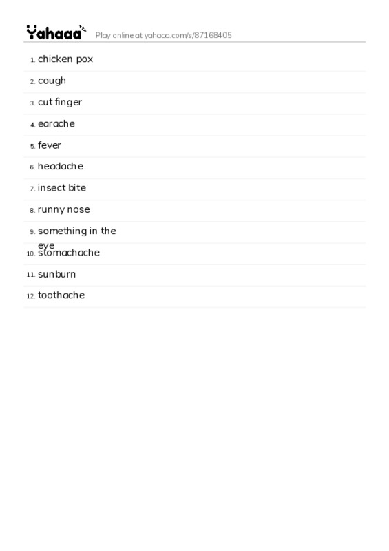 chicken pox, cough, cut finger, earache, fever, headache, insect bite, runny nose, something in the eye, stomachache, sunburn, toothache