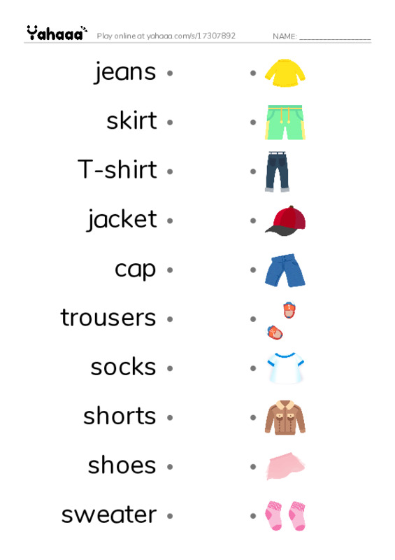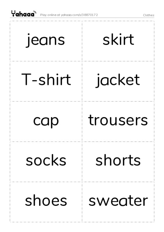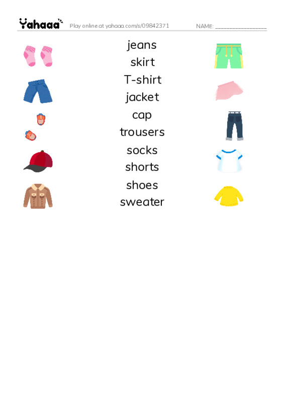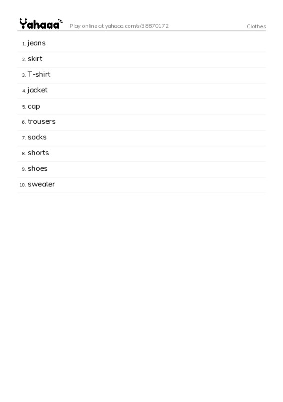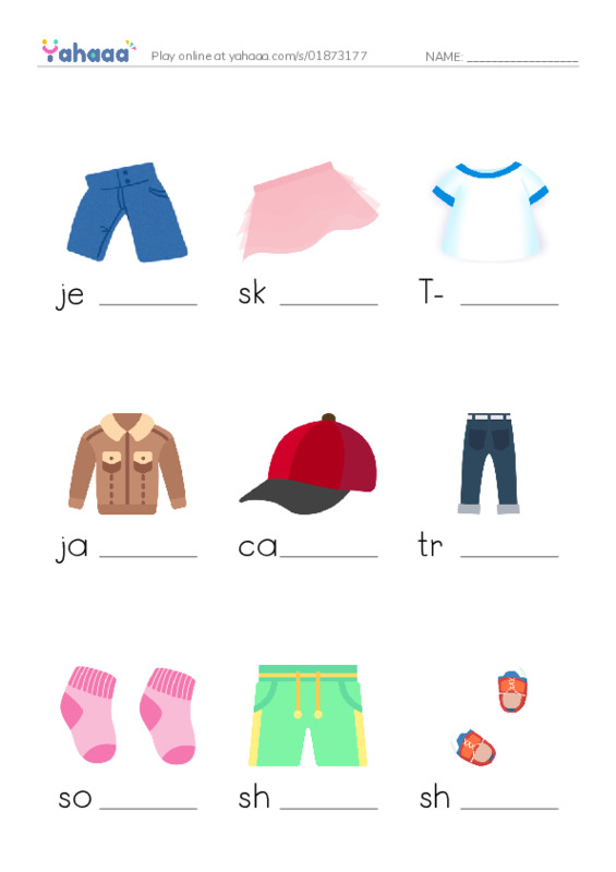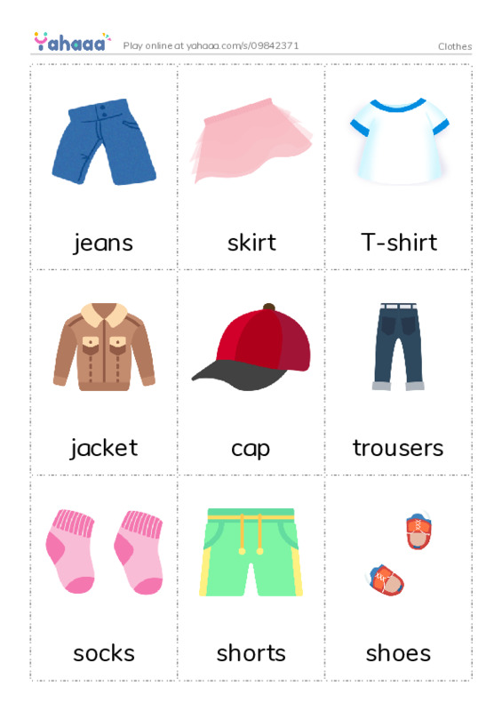 jeans, skirt, T-shirt, jacket, cap, trousers, socks, shorts, shoes, sweater