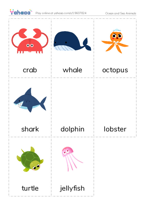 crab, whale, octopus, shark, dolphin, lobster, turtle, jellyfish