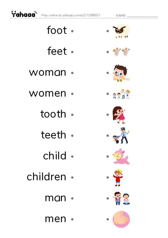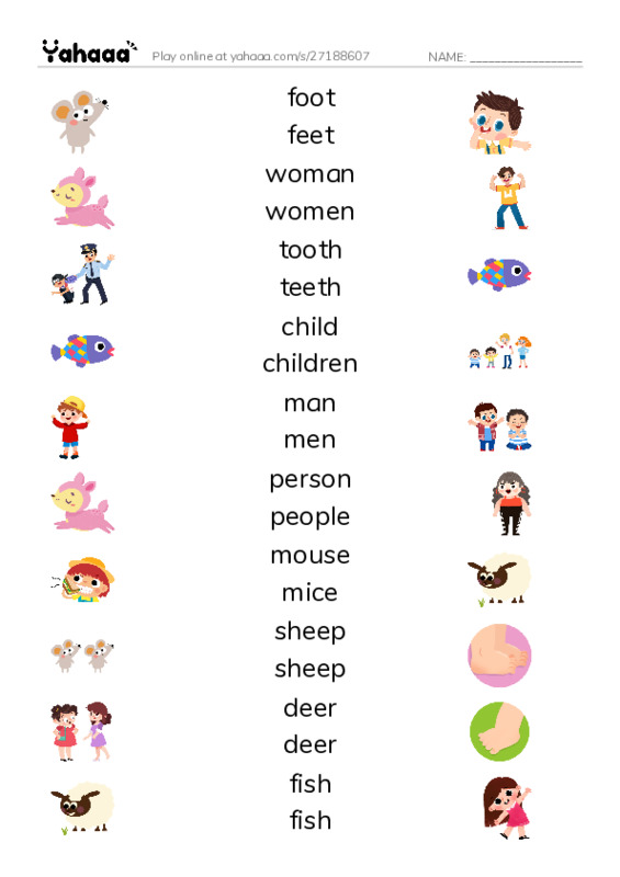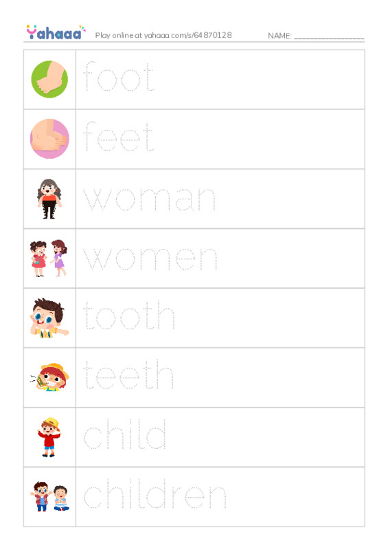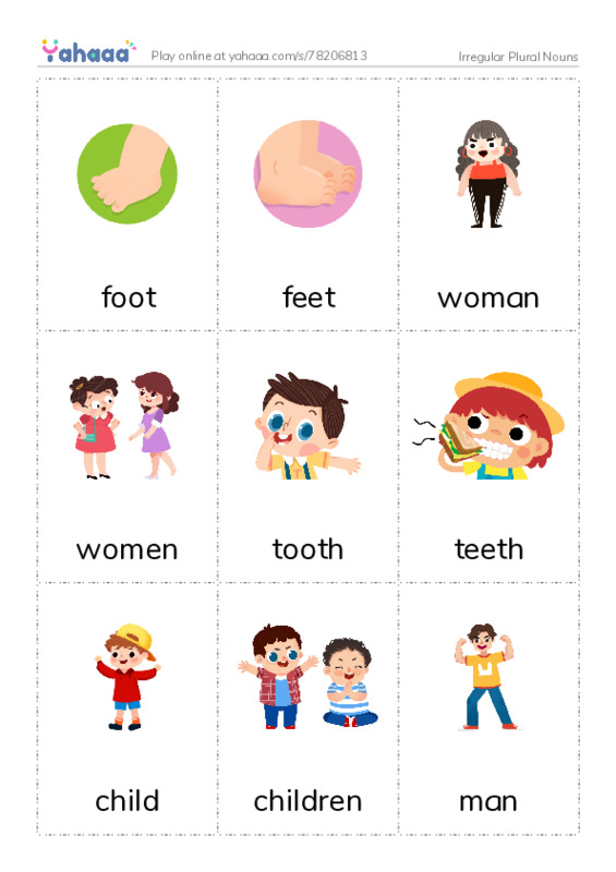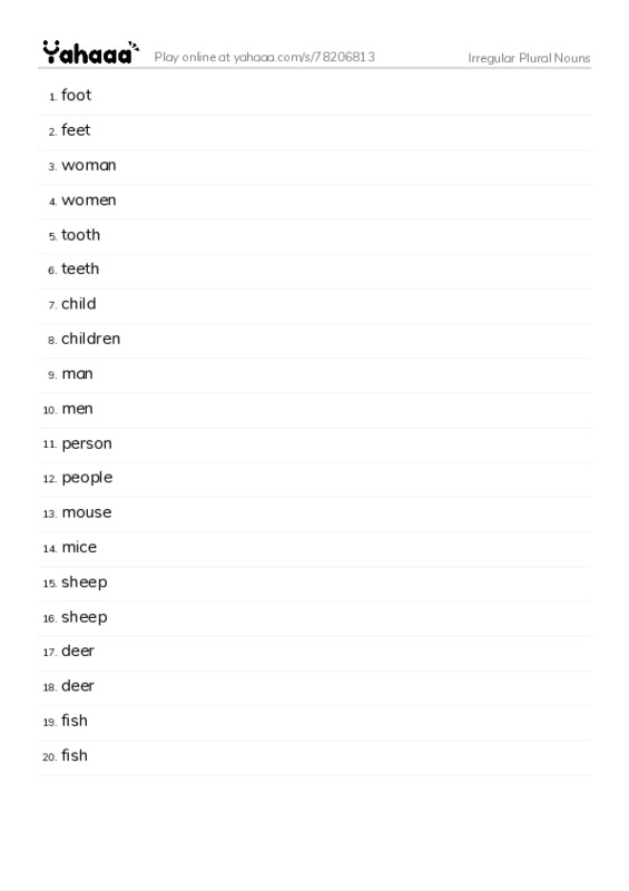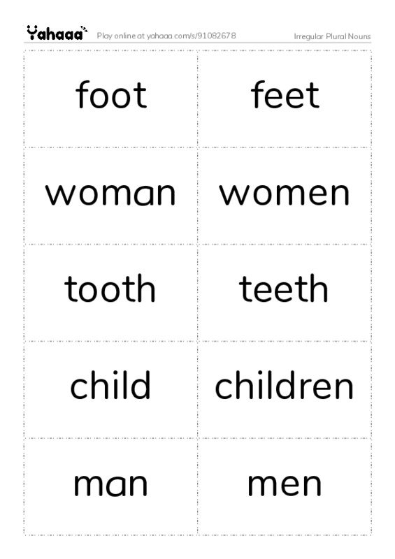 foot, feet, woman, women, tooth, teeth, child, children, man, men, person, people, mouse, mice, sheep, deer, fish