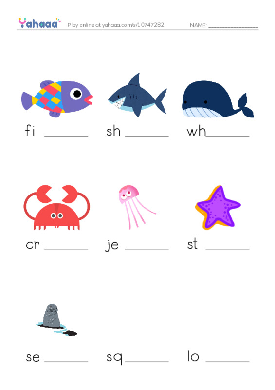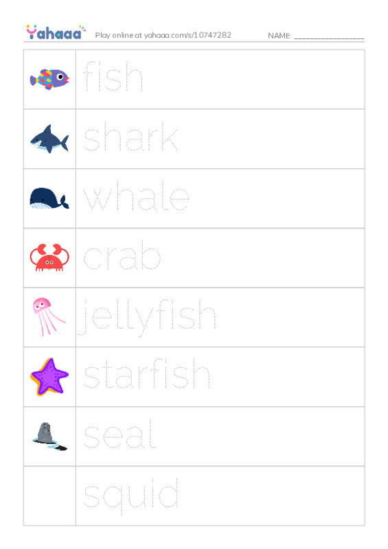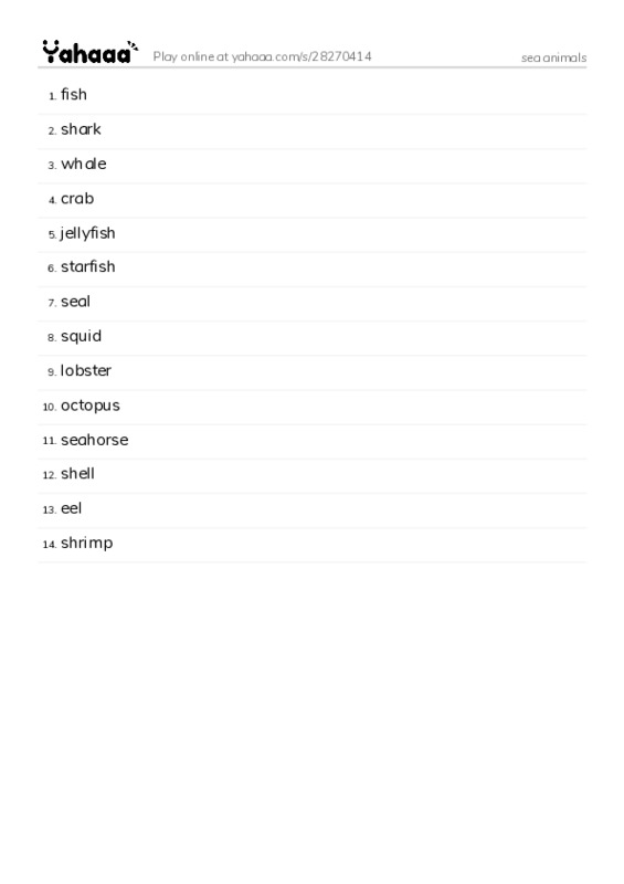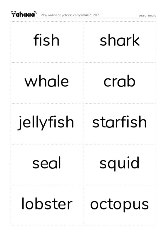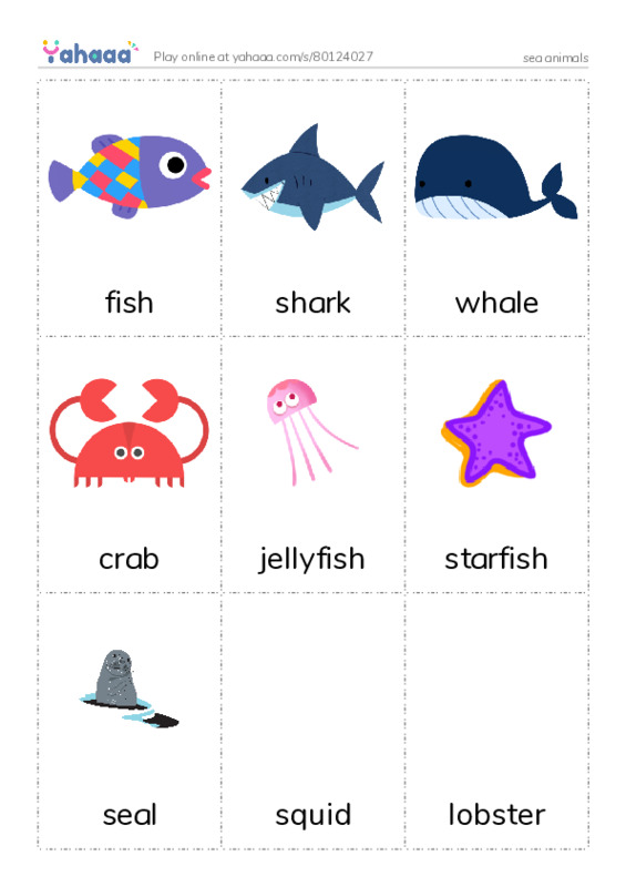 fish, shark, whale, crab, jellyfish, starfish, seal, squid, lobster, octopus, seahorse, shell, eel, shrimp