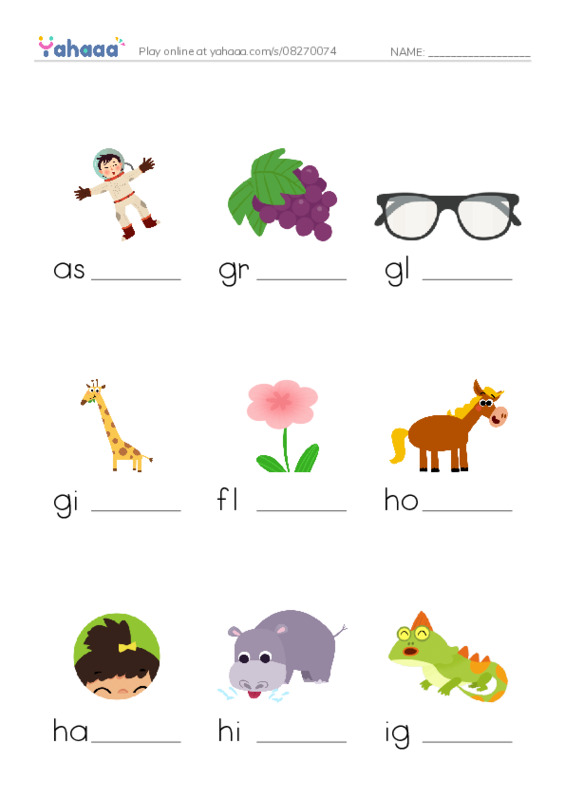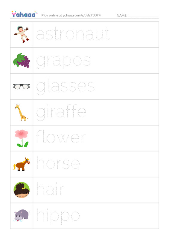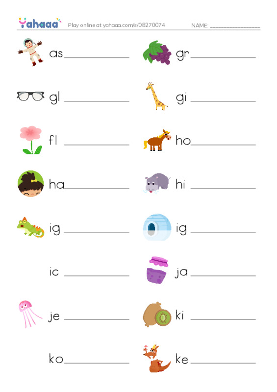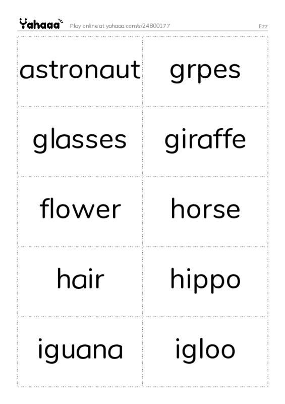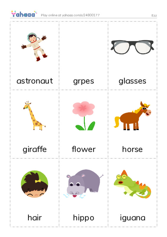 astronaut, grapes, glasses, giraffe, flower, horse, hair, hippo, iguana, igloo, icekream, jam, jellyfish, kiwi, koala, key, lion, lamp, lizard