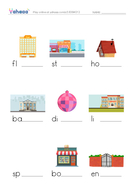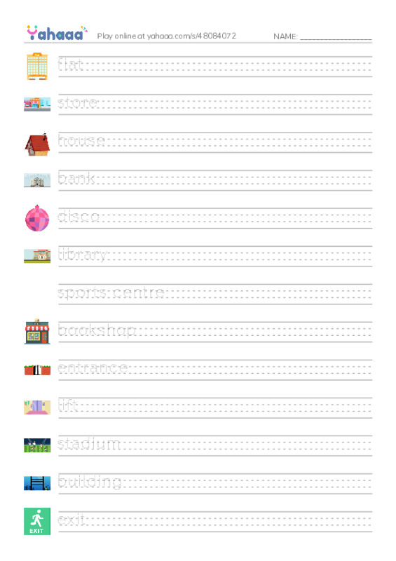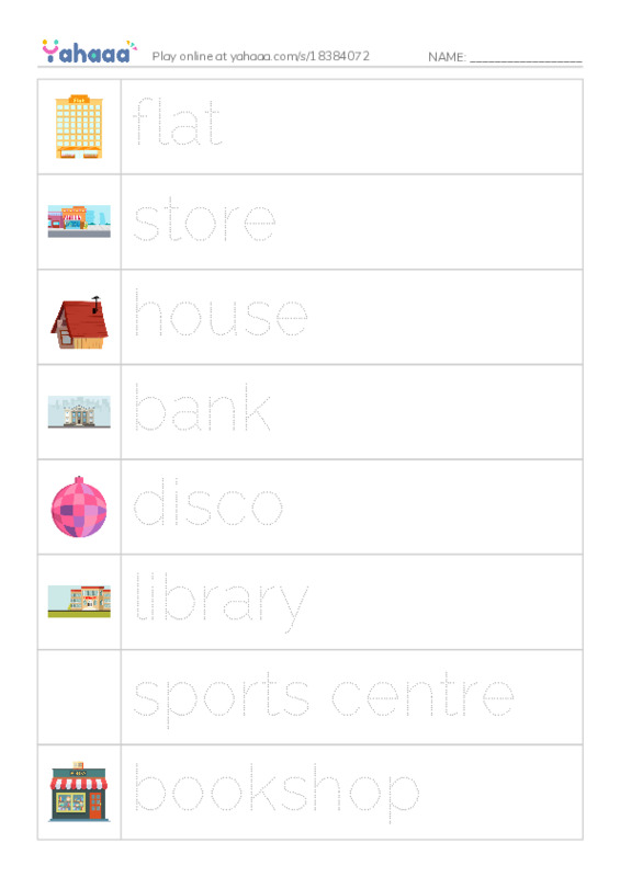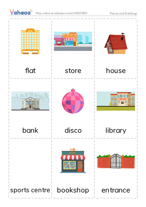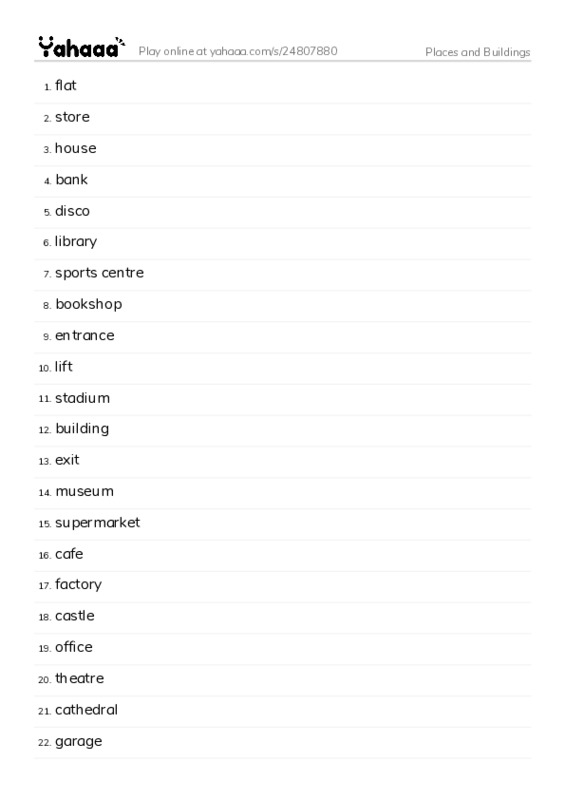 flat, store, house, bank, disco, library, sports centre, bookshop, entrance, lift, stadium, building, exit, museum, supermarket, cafe, factory, castle, office, theatre, cathedral, garage, police station, university, church, post office, cinema, hospital, college, hotel, school