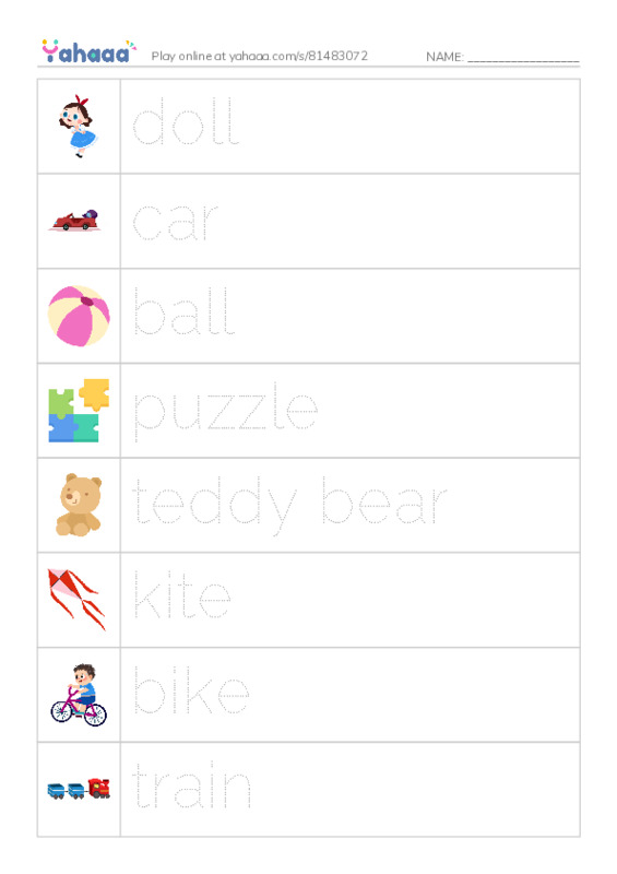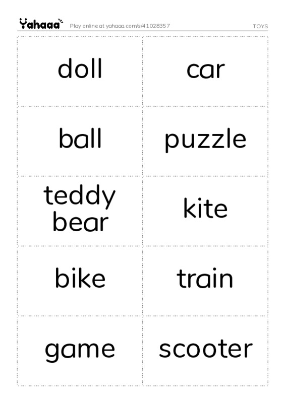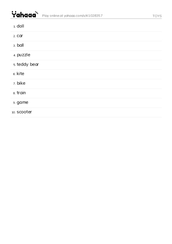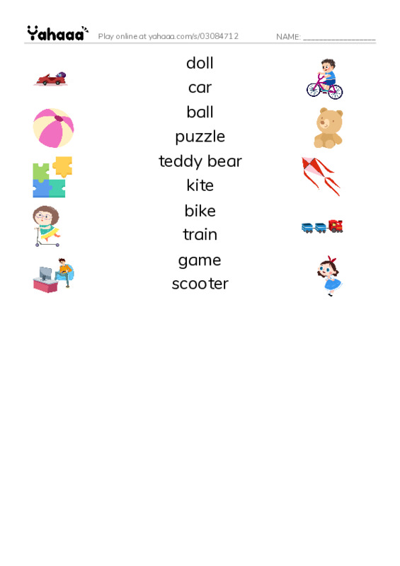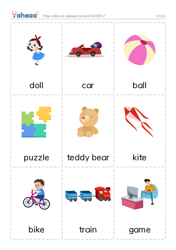 doll, car, ball, puzzle, teddy bear, kite, bike, train, game, scooter