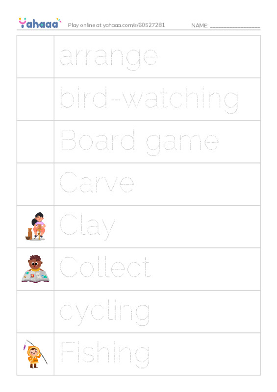 arrange, bird-watching, Board game, Carve, Clay, Collect, cycling, Fishing, Hobby, Model, Pottery, Skate, Take photos, Take up, Unusual