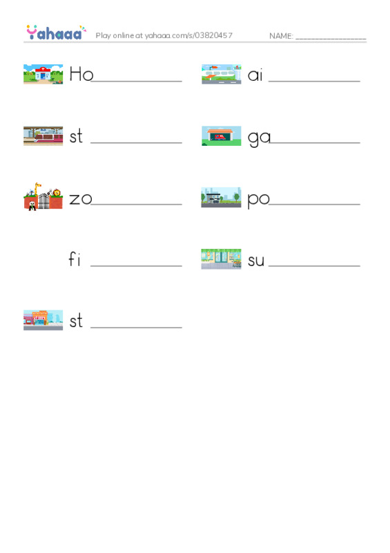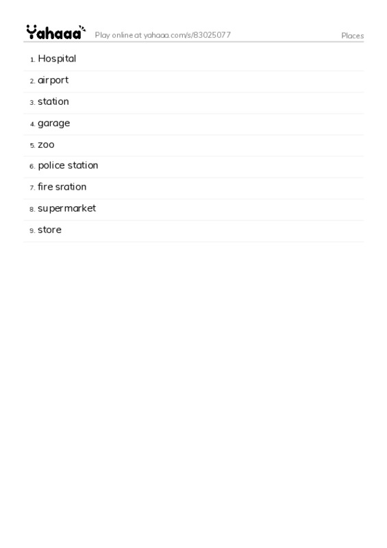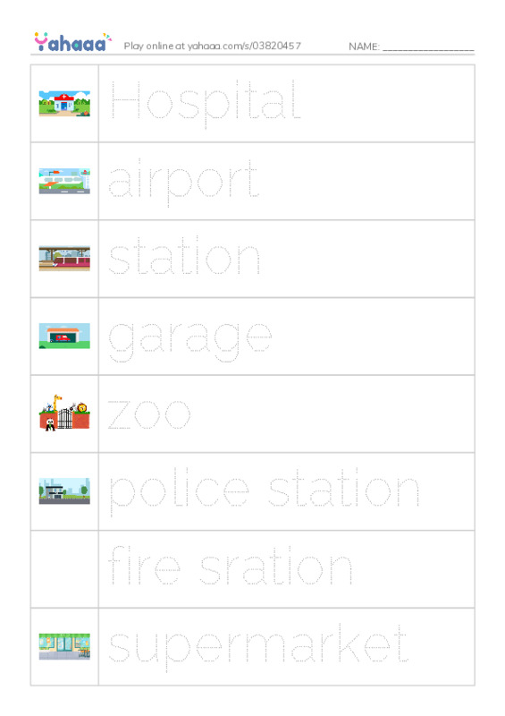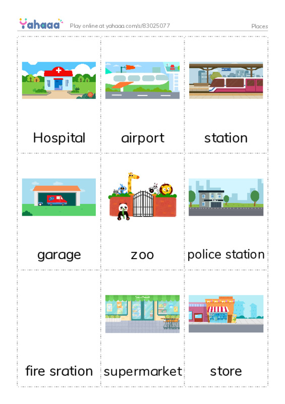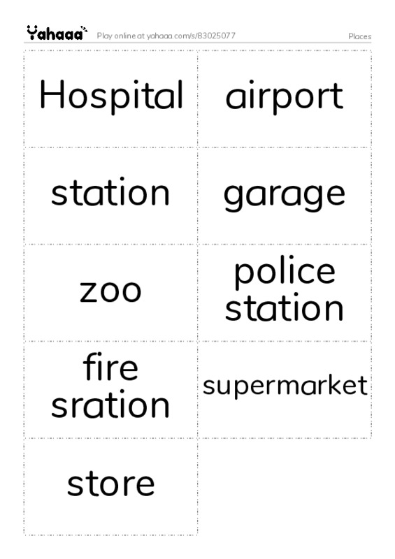 Hospital, airport, station, garage, zoo, police station, fire sration, supermarket, store