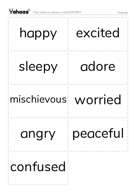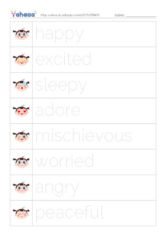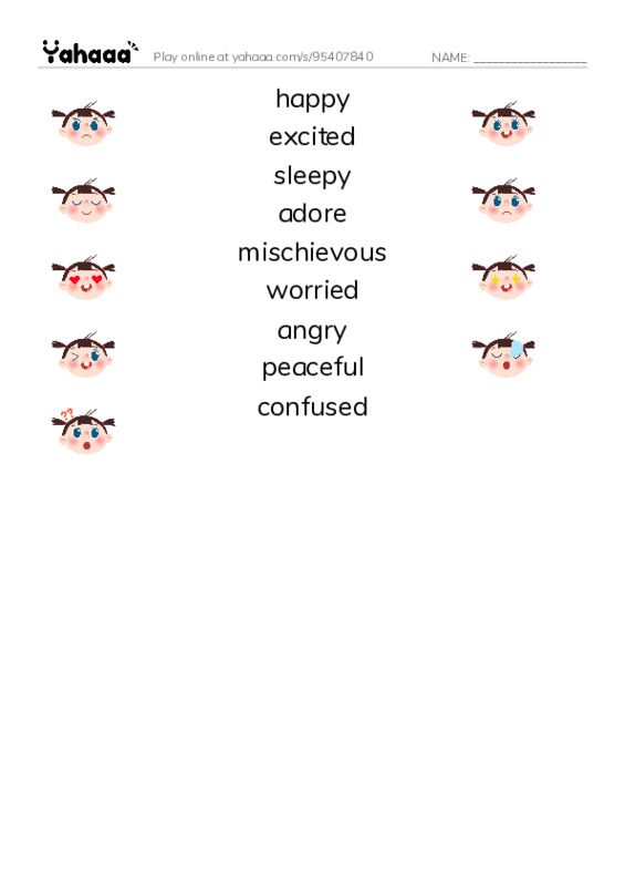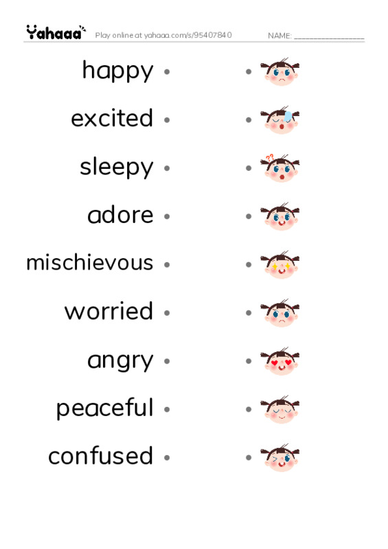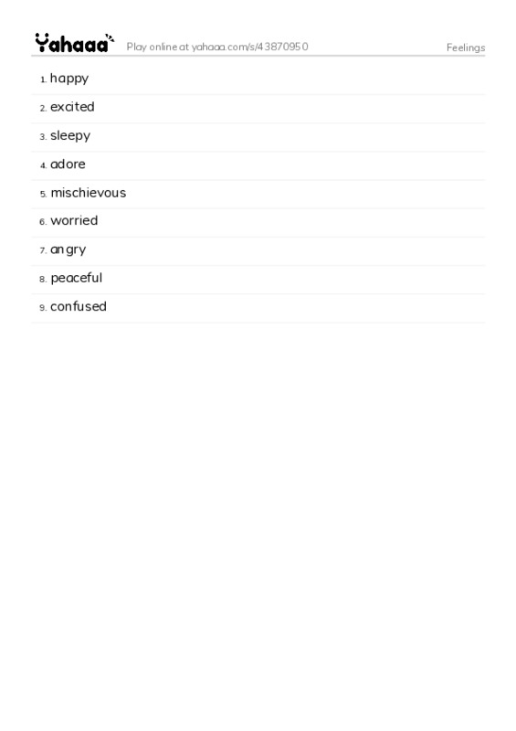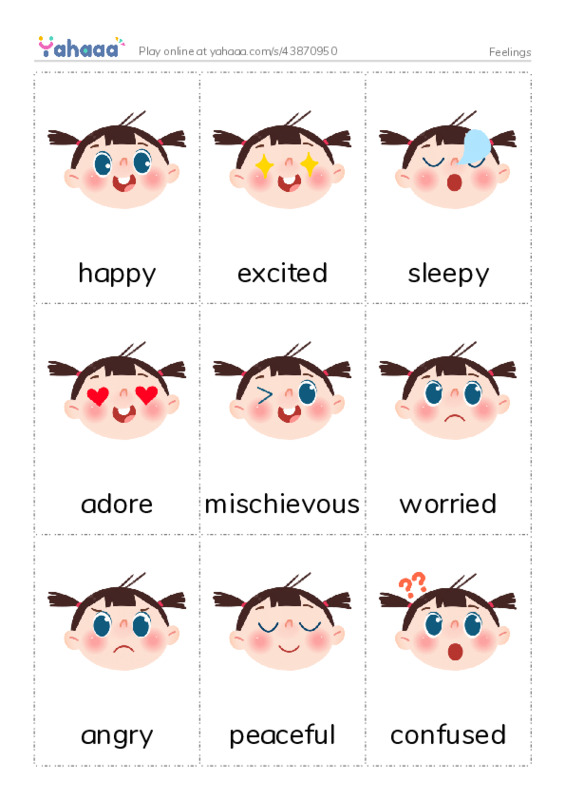 happy, excited, sleepy, adore, mischievous, worried, angry, peaceful, confused