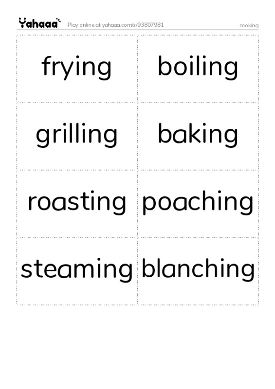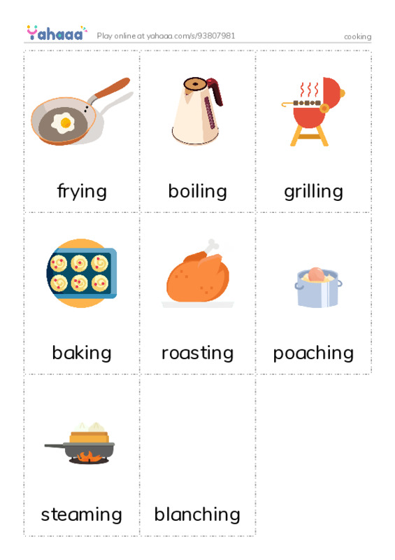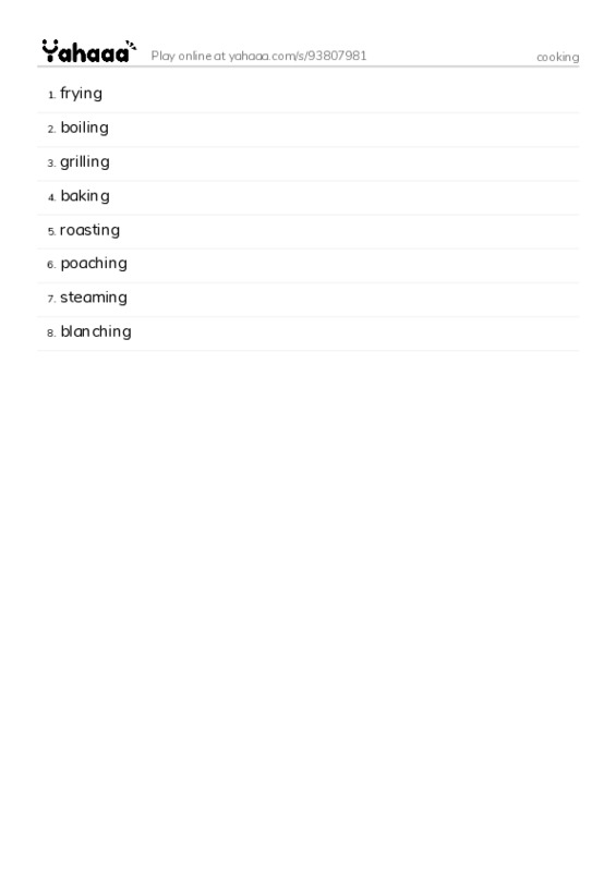 frying, boiling, grilling, baking, roasting, poaching, steaming, blanching
