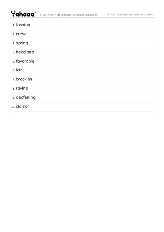 fashion, crew, spring, headland, favorable, lair, brackish, ravine, deafening, clamor