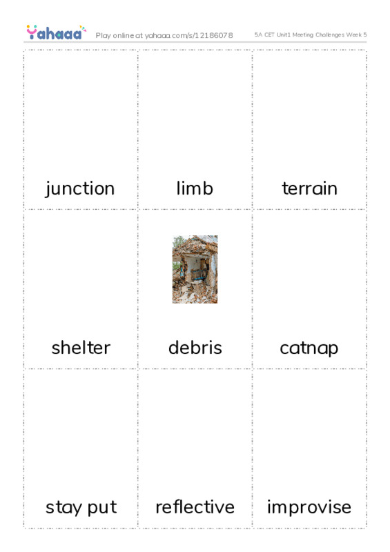 junction, limb, terrain, shelter, debris, catnap, stay put, reflective, improvise, lens